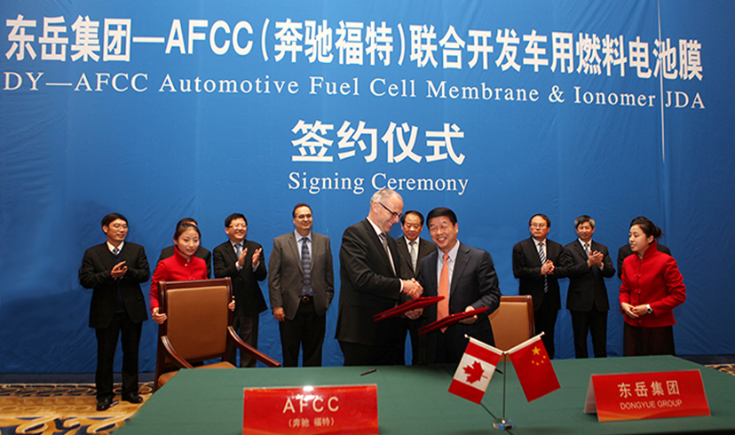 On November 27, 2013, Dongyue signed a contract with AFCC, a joint venture between Mercedes Benz and Ford, to jointly develop ionic exchange membranes for future mass production of hydrogen fuel cell vehicles by the two major automotive giants.